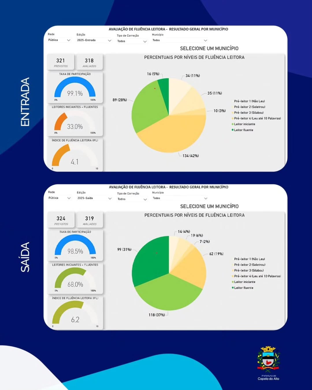 A Prefeitura de Capela do Alto e a Secretaria Municipal de Educação, celebra os excelentes resultados das escolas municipais na Avaliação de Fluência Leitora do programa Alfabetiza Juntos SP – 2025.Durante o ano, o município avançou 2,1 pontos no índice de crianças leitoras, saindo de 4,1 para 6,2 (em uma escala de 1 a 10), com unidades escolares registrando crescimento superior a 2,5 pontos.Iniciamos 2025 com 33% das crianças leitoras e encerramos o ano com 68% dos alunos da rede, até o final do 2º ano, no nível de leitores fluentes.Esses resultados refletem a dedicação das equipes escolares, o compromisso com a alfabetização e a capacidade da nossa rede de alcançar e superar metas, transformando a educação do município.#capeladoalto #educacao #alfabetizaçao #leitura #alfabetizajuntossp